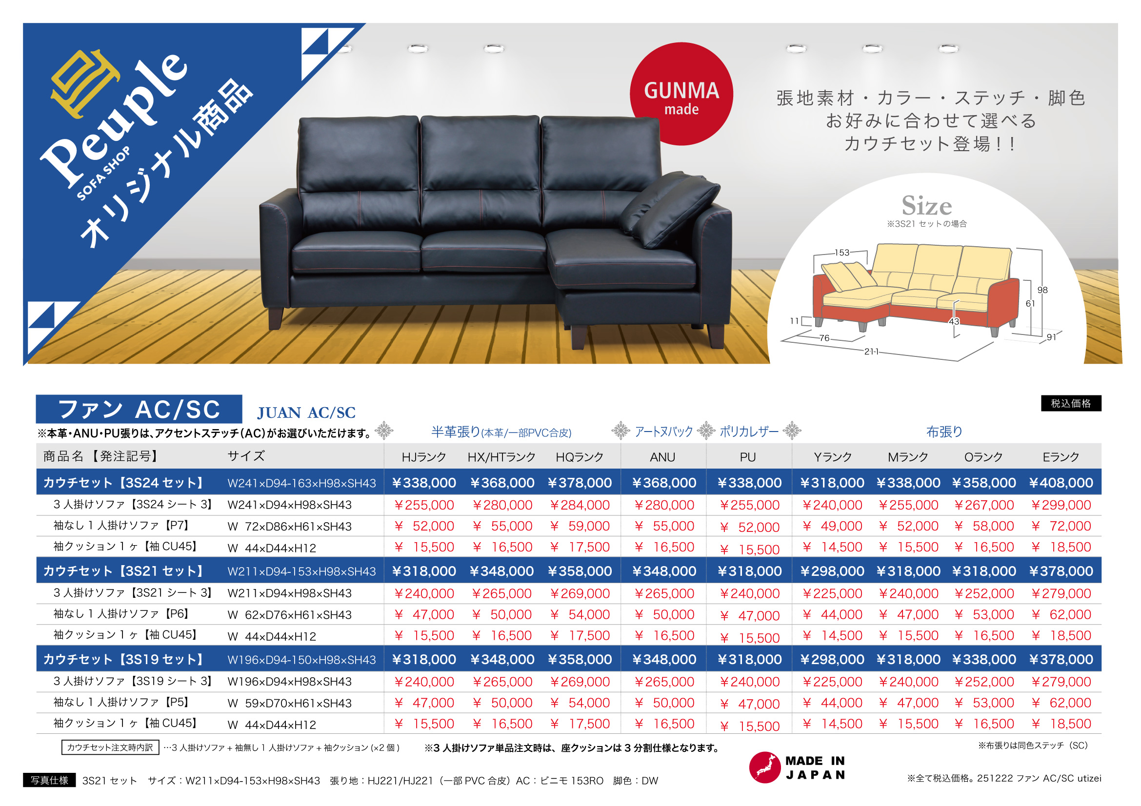 ※カウチセット(3S21セット)の場合(単位:cm)