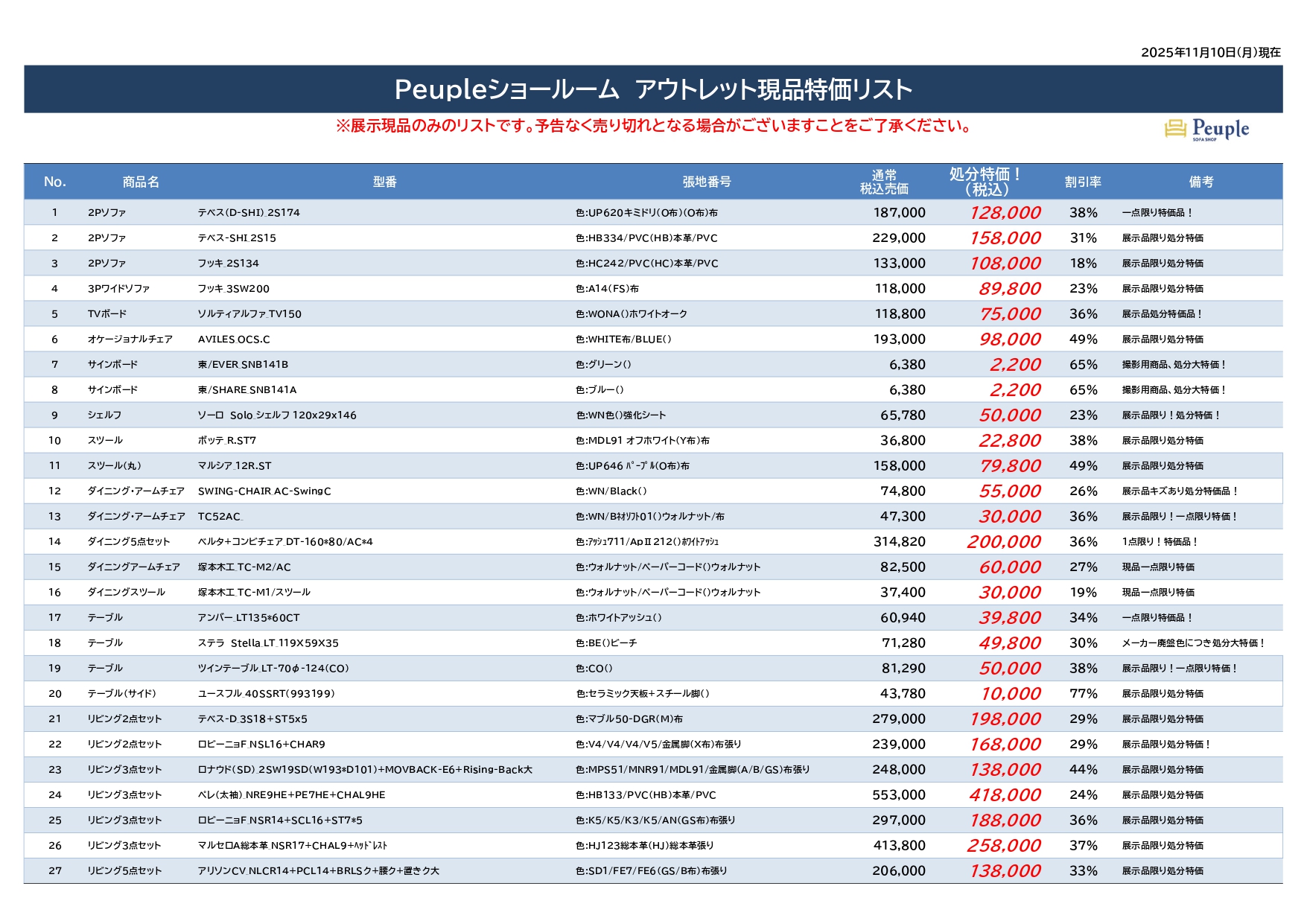 試作品などの現品特価品と、サイズ・素材・色などを選んで注文する正規品がございます。