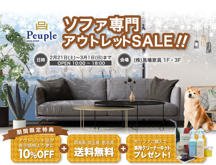 群馬県高崎市の馬場家具本社内にあるショールームにて「ソファ専門アウトレットセール」を開催いたします。 ソファ専門メーカー「馬場家具」のソファがアウトレット特価でお求めいただけます。