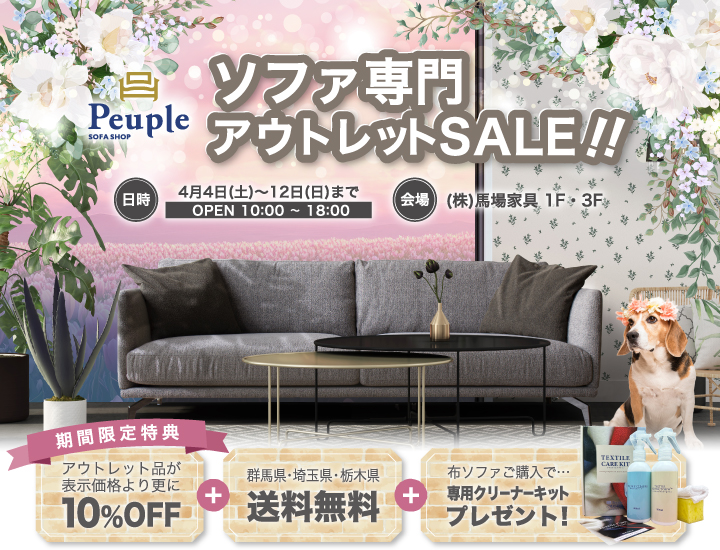 群馬県高崎市の馬場家具本社内にあるショールームにて「ソファ専門アウトレットセール」を開催いたします。 ソファ専門メーカー「馬場家具」のソファがアウトレット特価でお求めいただけます。