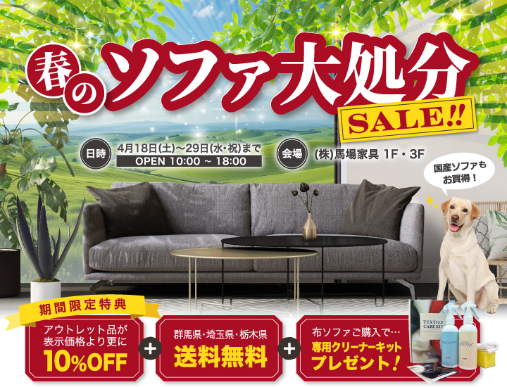 群馬県高崎市の馬場家具本社内にあるショールームにて「春のソファ大処分セール」を開催いたします。 ソファ専門メーカー「馬場家具」のソファがアウトレット特価でお求めいただけます。